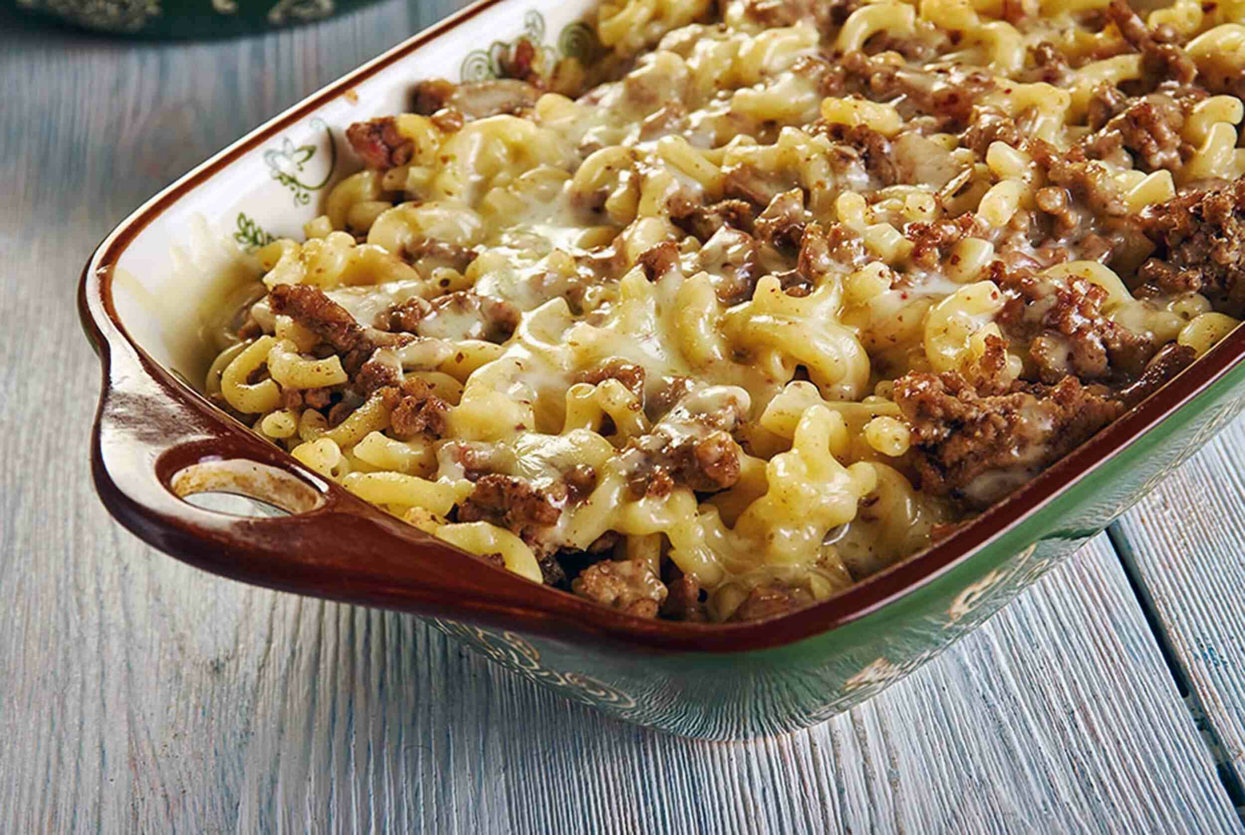 Step 10 -Spoon the beef mixture over the top of the macaroni.