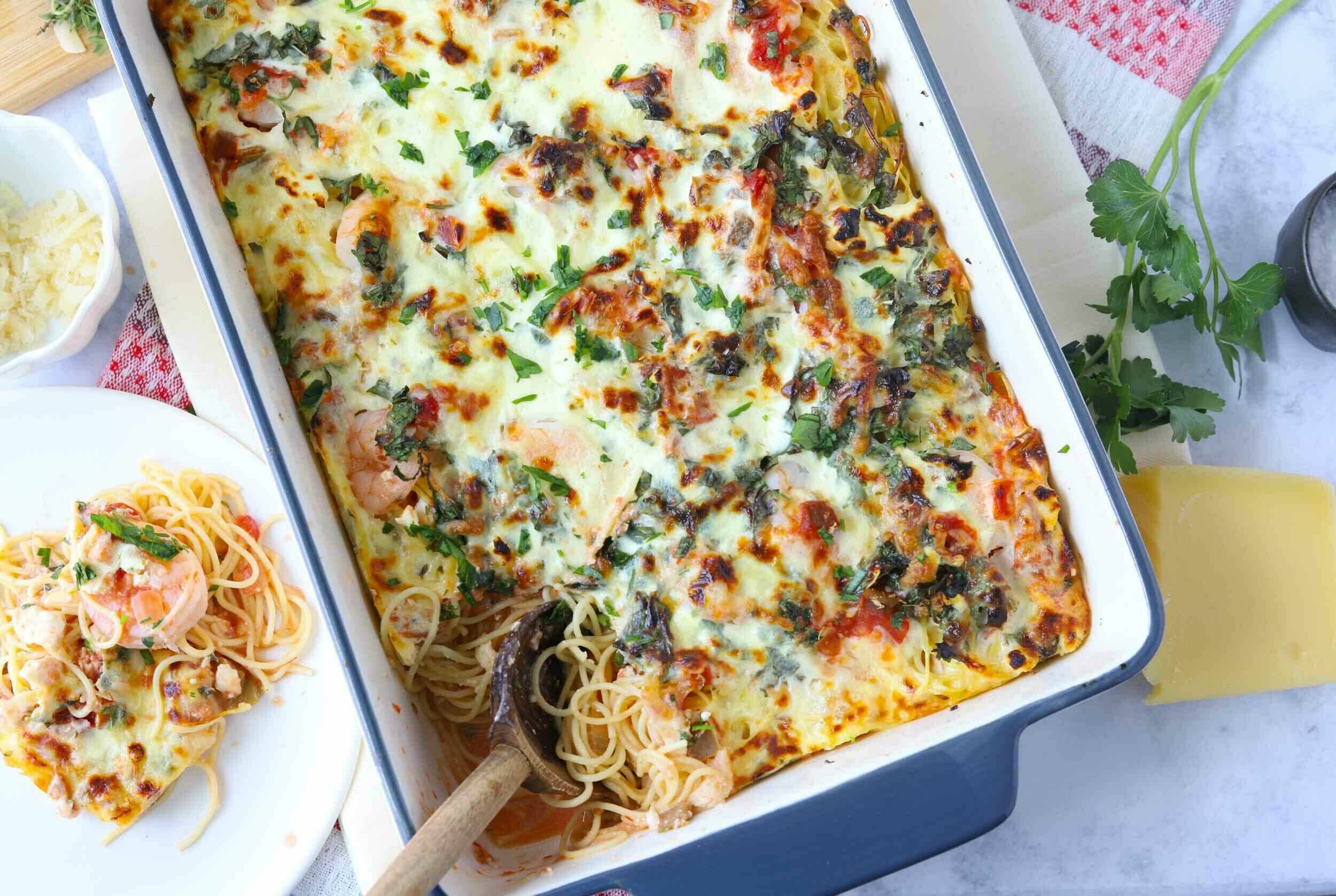 When the ocean is unreachable but is still calling your name, Coastal Pasta Bake provides the taste of the tropical shore you're longing for. Pink, plump shrimp are twirled together with waves of bouncy angel hair pasta, two types of melty cheeses, and a whole jar of chunky, tangy salsa. Yet another kind of savory cheese sprinkles the divine mix and swims in a sea of creamy goodness. While best eaten by the water, Coastal Pasta Bake will make life feel like a beach anywhere you go.