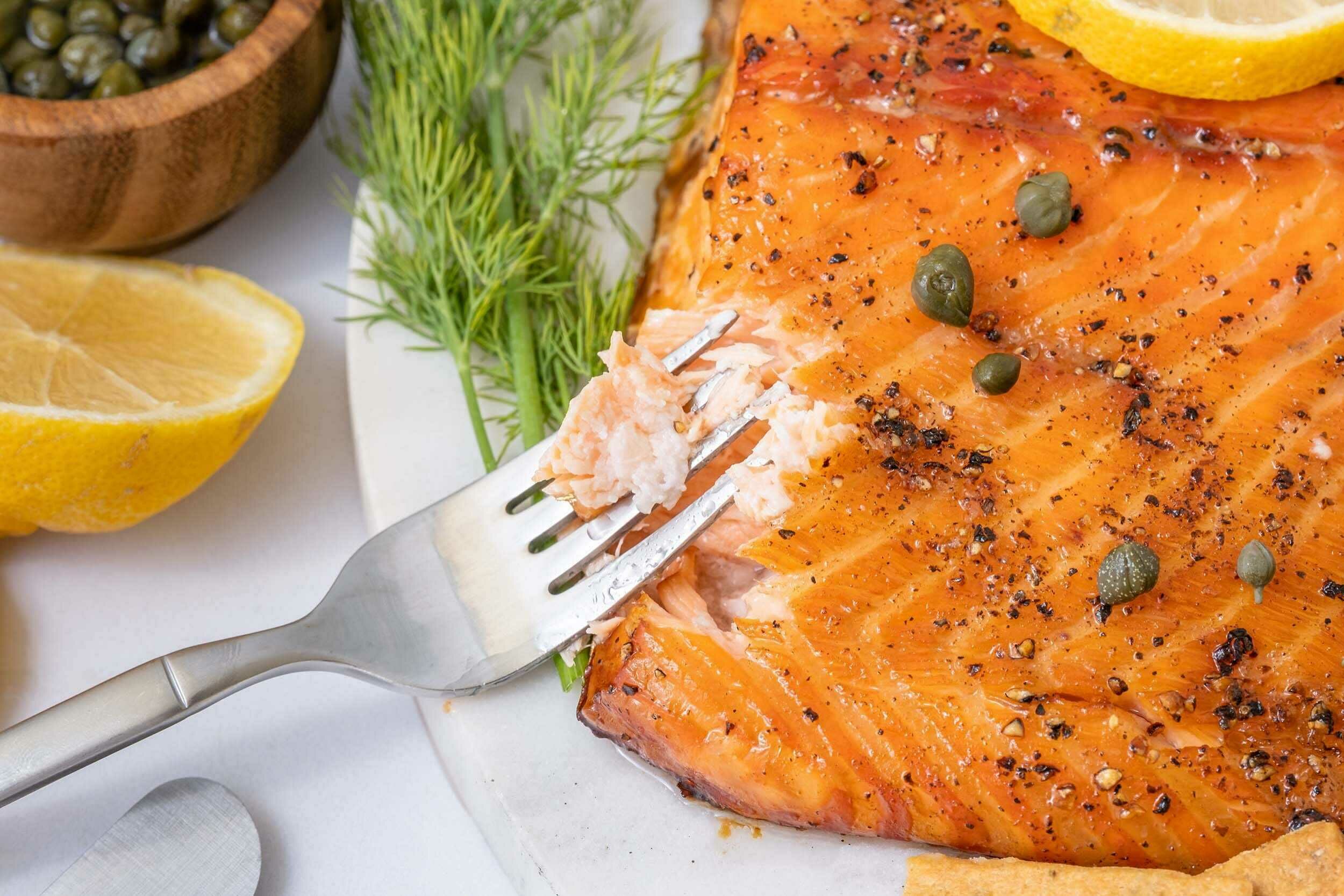 Smoked salmon is one of the most versatile dishes ever created, as equally welcome on the dinner table as it is in the brunch spread. This Easy Smoked Salmon is the perfect way to dazzle the crowd at your next holiday party: the beautiful orangey-pink flesh will get people buzzing, as will the tender, smoky, and savory-sweet flavor. Easy Smoked Salmon might be a bit of a time commitment, but with a touch of citrus from the garnishes, it is so worth it—especially because it truly is easy to make.