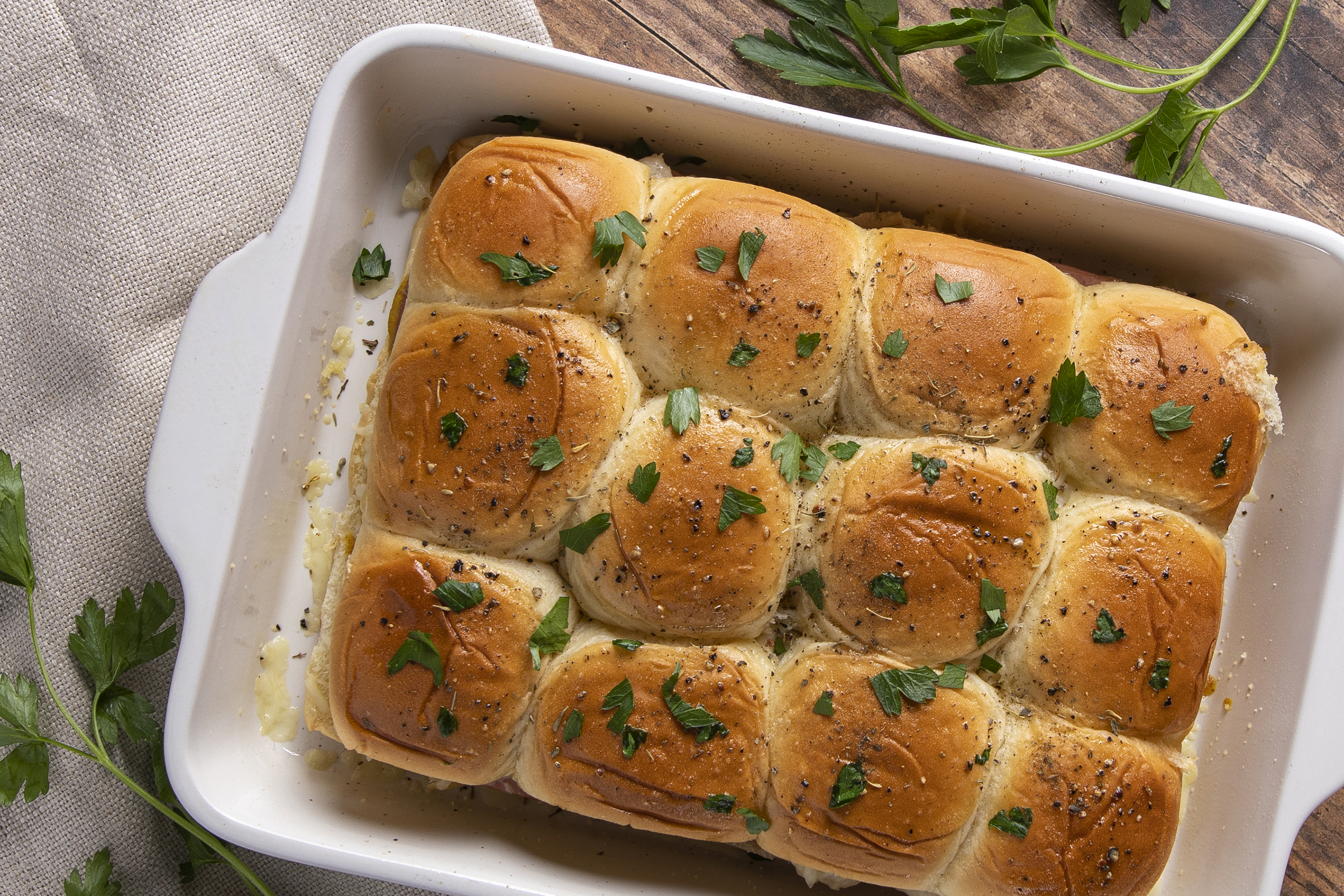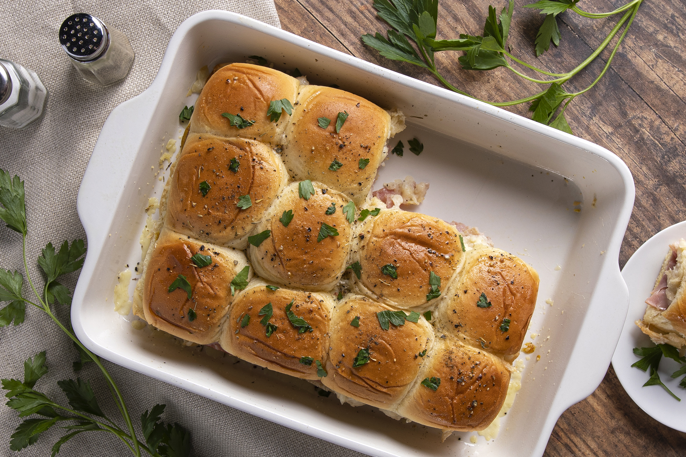 Few pairings are as beloved as ham and cheese! Savory ham and melty cheese in a sandwich are truly a match made in heaven. And it doesn't get more heavenly than Ham & Cheese Sliders! Each slider, brushed with melted butter, is filled with the classic meat-and-cheese (using smoky, creamy Gruyère), a rich cream sauce, and sweet and tangy honey mustard all within a fluffy roll. Thankfully, Ham & Cheese Sliders make enough for a crowd, because everyone deserves (and is going to want) a sandwich this good!