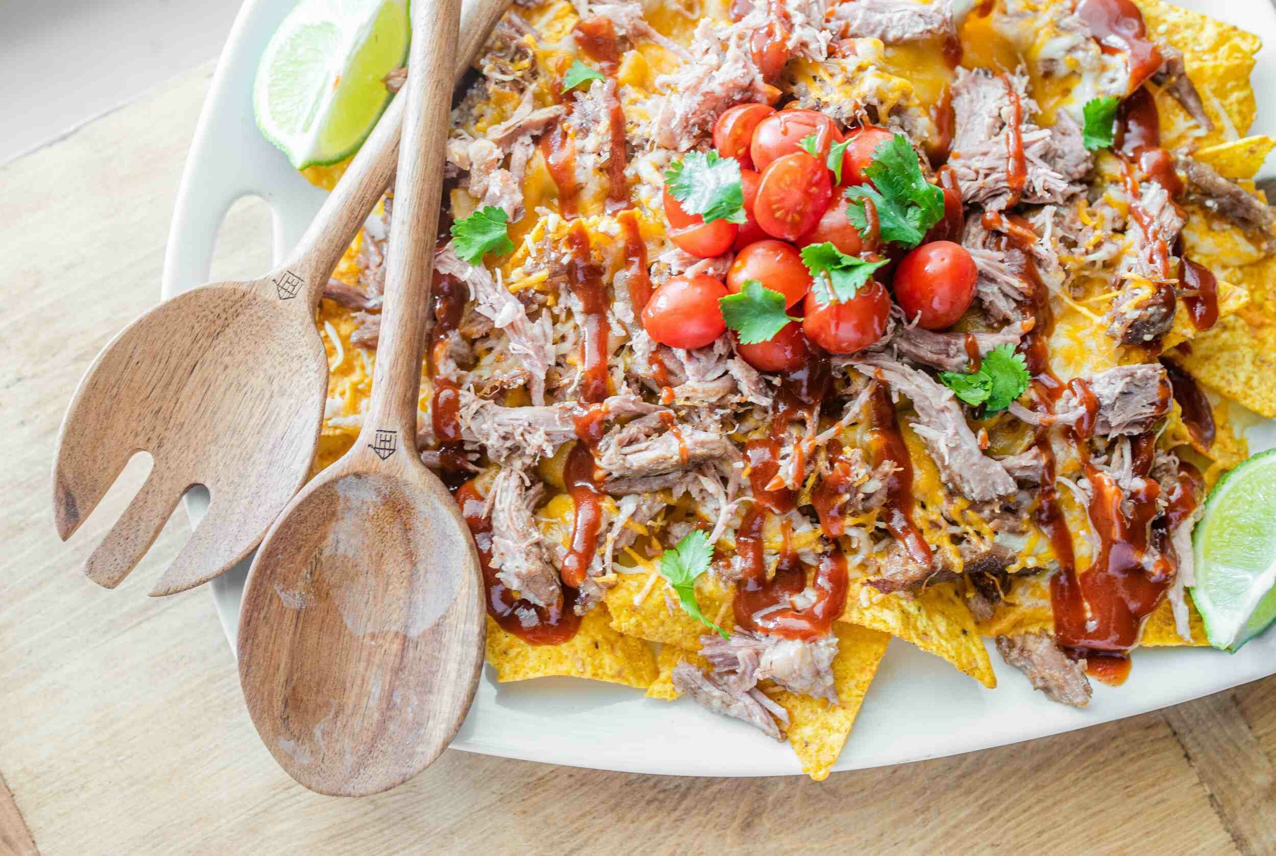 Step 7 -In a cast iron pan or a baking dish, build the nachos in layers, starting with the tortilla chips, and adding on the pork, onion, BBQ sauce, and the cheese. Repeat the process as desired for any additional layers.