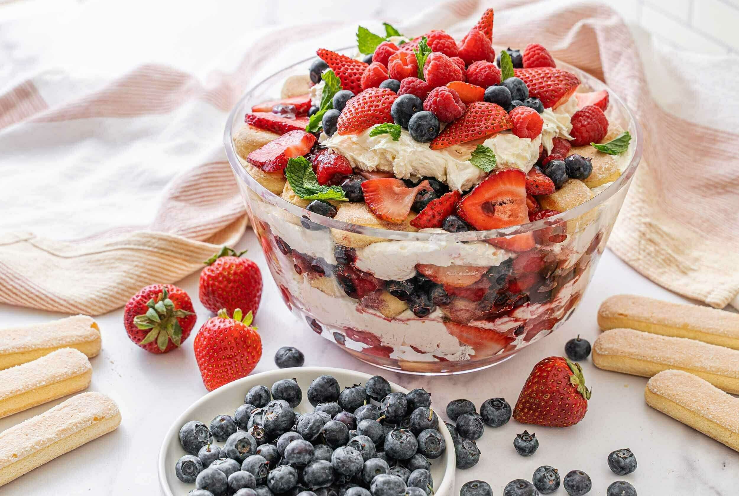 It may be called a trifle, but few desserts are as substantially satisfying or as delicious! The Summer Trifle is layer upon layer of sweetness, from the fluffy cream stripes to the bands of jammy, bright, tart berries and the spongy, soaked ladyfingers. This dessert is traditionally served in a glass dish because all the layers deserve to be marveled at... and then thoroughly enjoyed by the heaping bowlful! The Summer Trifle beckons you to enjoy it just as you would a mild sunny day!
