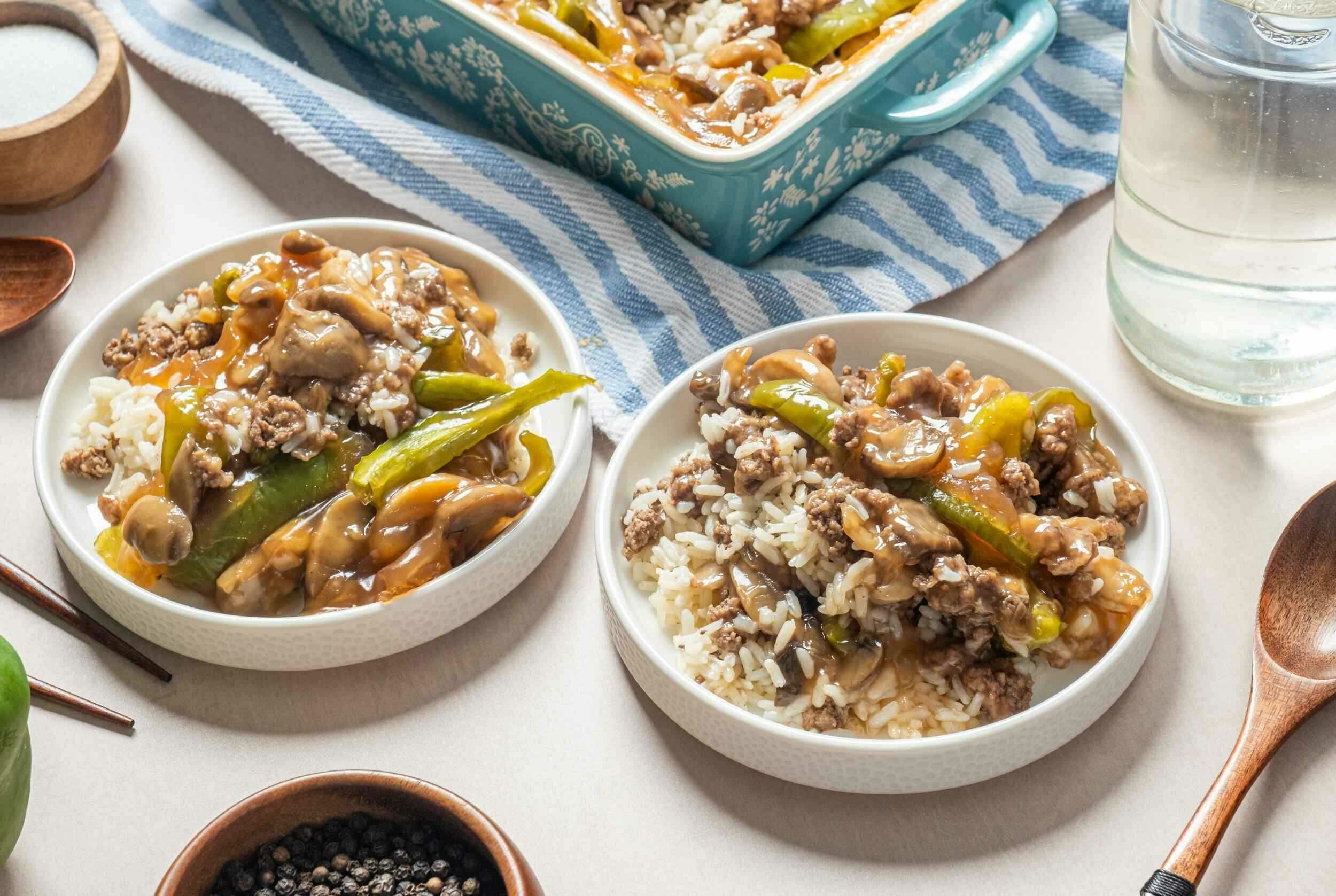 Step 6 -In the prepared baking dish, layer the cooked rice, beef mixture, mushrooms, and green peppers. Set aside.